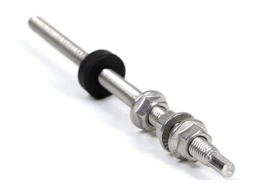Šroub se dvěma závity z nerezové oceli pro použití na plechových krytinách.