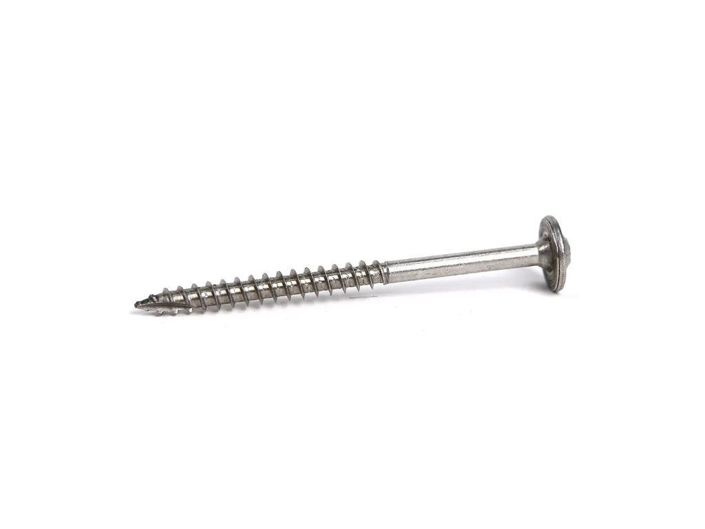 Vrut do dřeva z nerezové oceli pro správné uchycení střešních háků skrz kontralať do trámu.